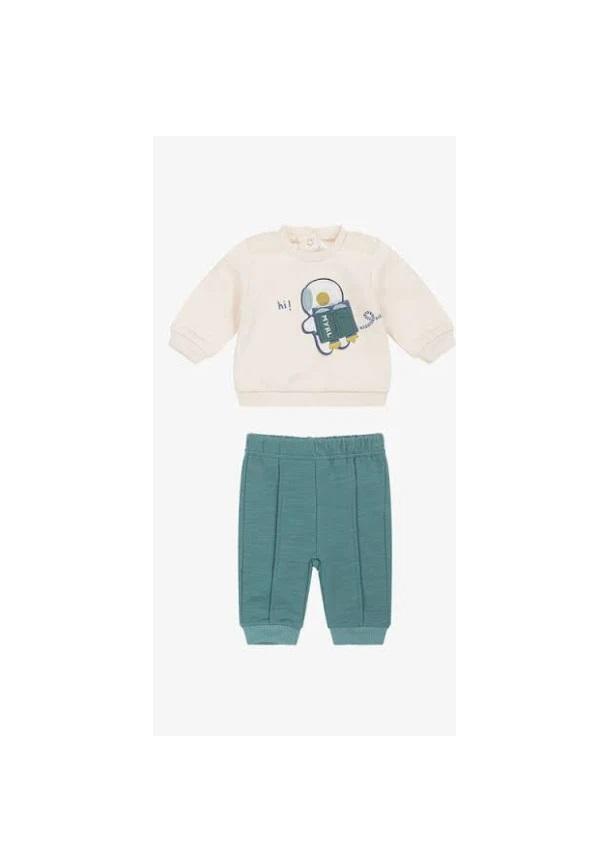 2/ Sudadera de manga larga. Cuello redondo. Cierre con botones a presión en la parte posterior. Bolsillo funcional en la parte delantera. Elementos de adorno: serigrafía (print). Pantalón largo deportivo para recién nacido de gran confort. Cinturilla elástica. Bajo elástico para un mejor ajuste.