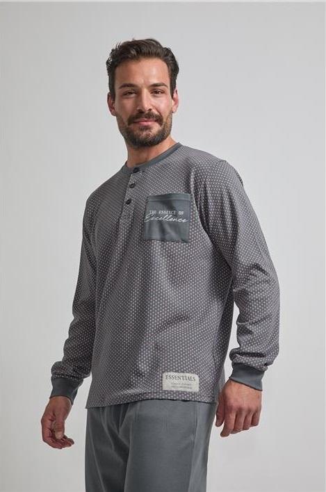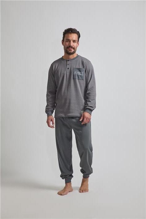 Pijama hombre de algodón interlock con botones semiabierto y bolsillo, terminación de puño en mangas, y pantalón liso con terminación en puño
