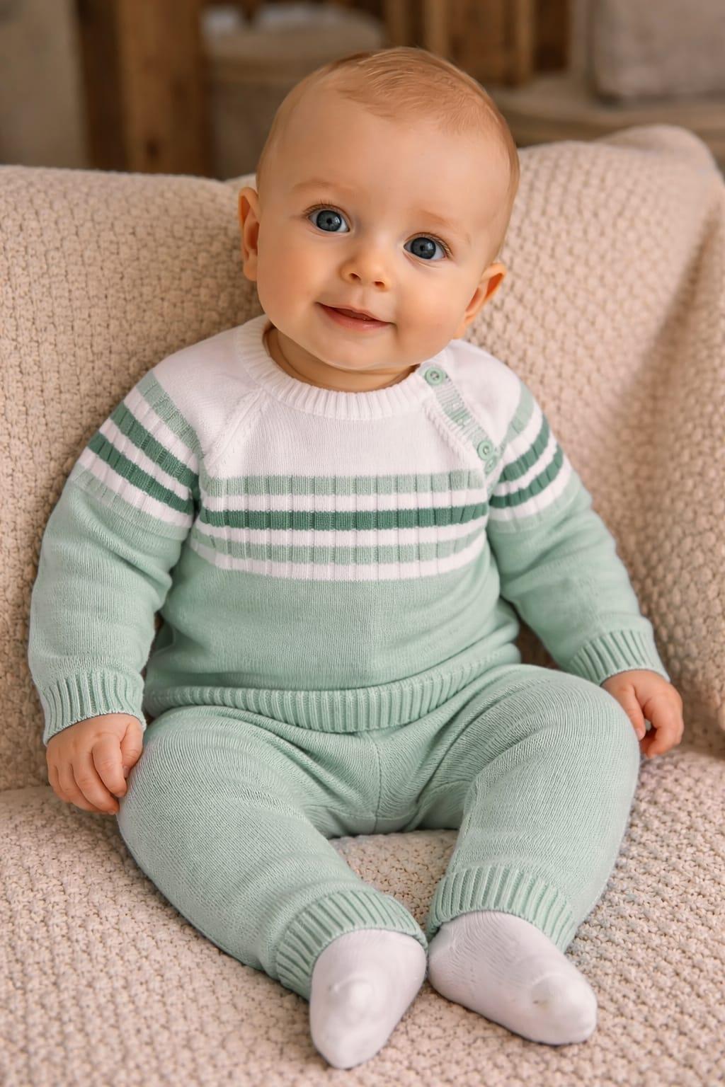 Original conjunto de tricot en algodónpara recién nacido. Jersey de manga larga. Cuello redondo. Cierre lateral con botones. Pantalón tricot algodón con cinturilla elástica.