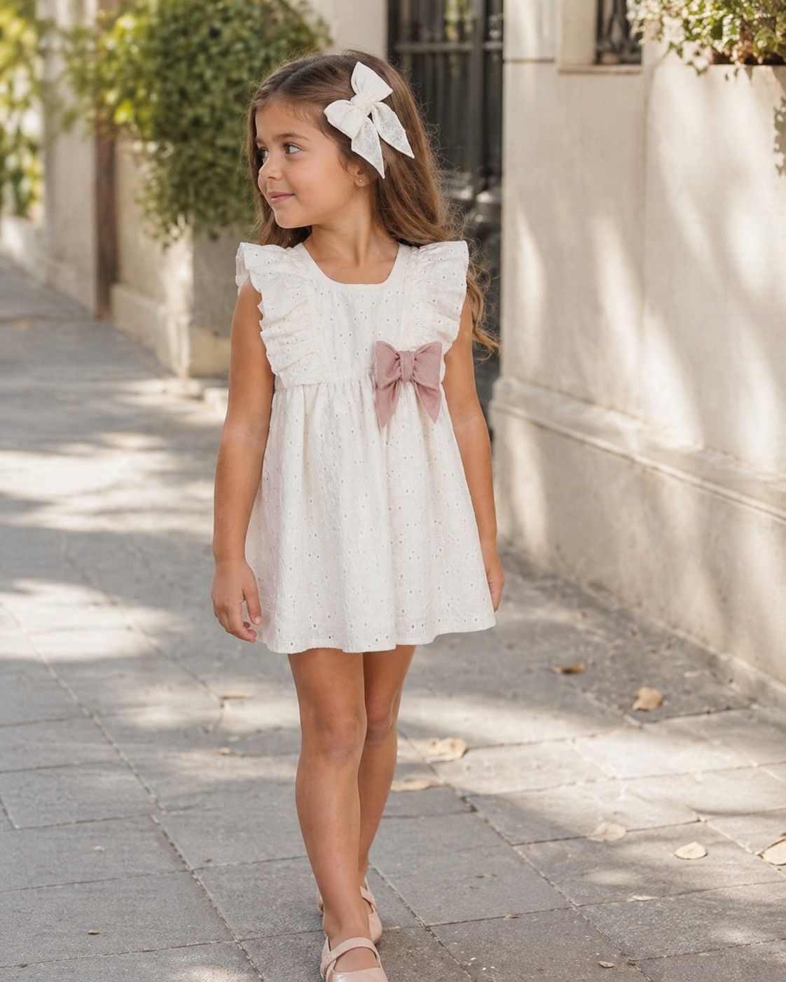 Vestido niña en precioso tejido troquelado, sin mangas y adorno on lazo en contraste, Lazo no incluído.