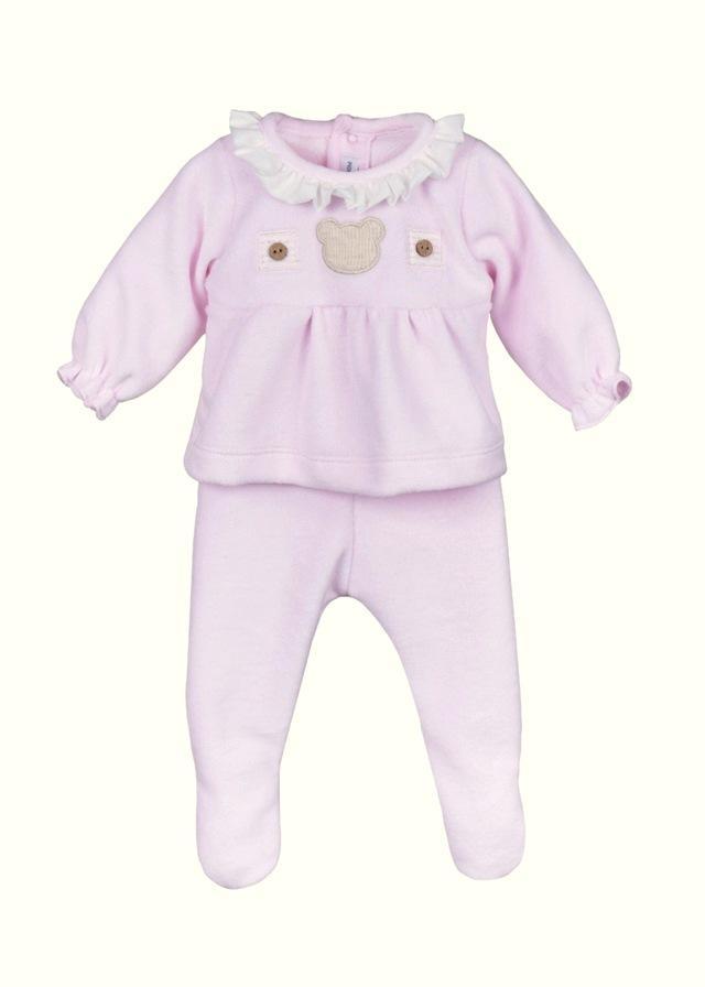 Conjunto Polaina de suave terciopelo para recién nacida, Sudadera con bordado y botones decorativos cuello con volantito y puños ligeramente fruncidos, polaina lisa.Ver Colección Odiel