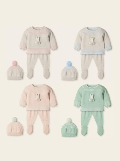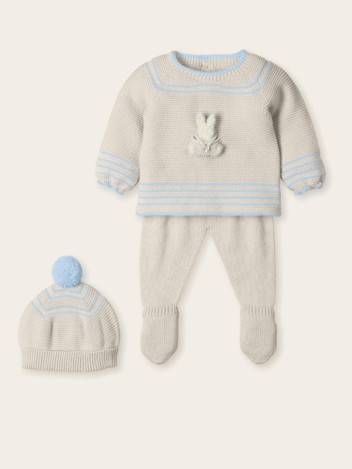 Conjunto de bebé para primera puesta, de 3 piezas en punto muy cálido y suave, jersey de manga ranglan con aplique de conejito en delantero y abertura en espalda con botones, polaina lisa y gorro con pompón.