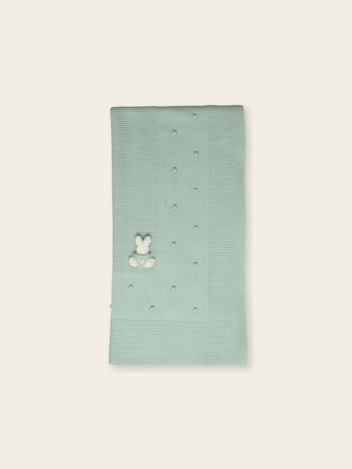 Conjunto de bebé para primera puesta, de 3 piezas en punto muy cálido y suave, jersey de manga ranglan con aplique de conejito en delantero y abertura en espalda con botones, polaina lisa y gorro con pompón.