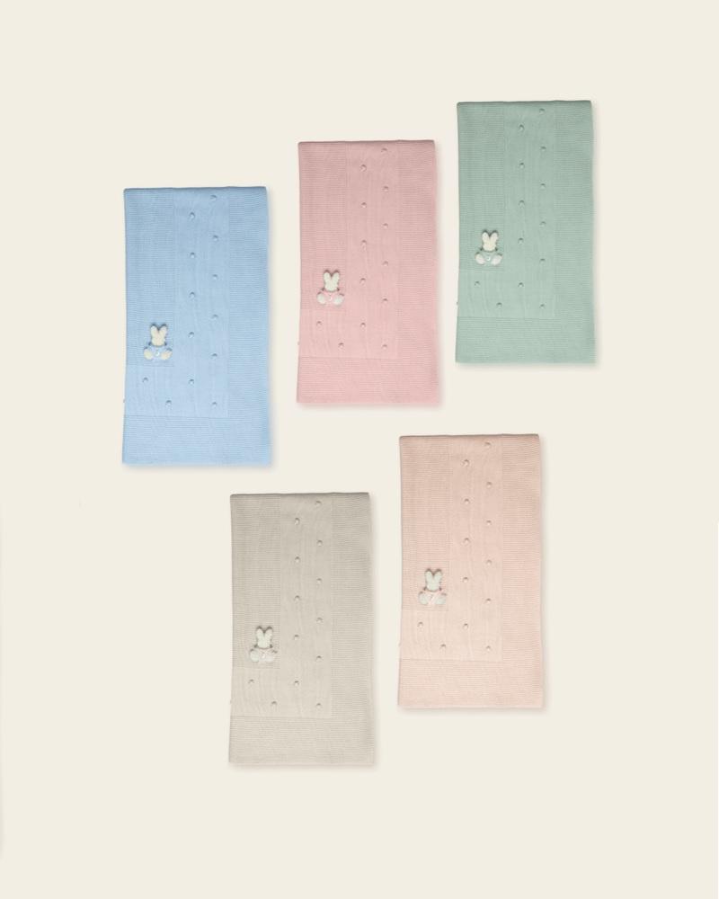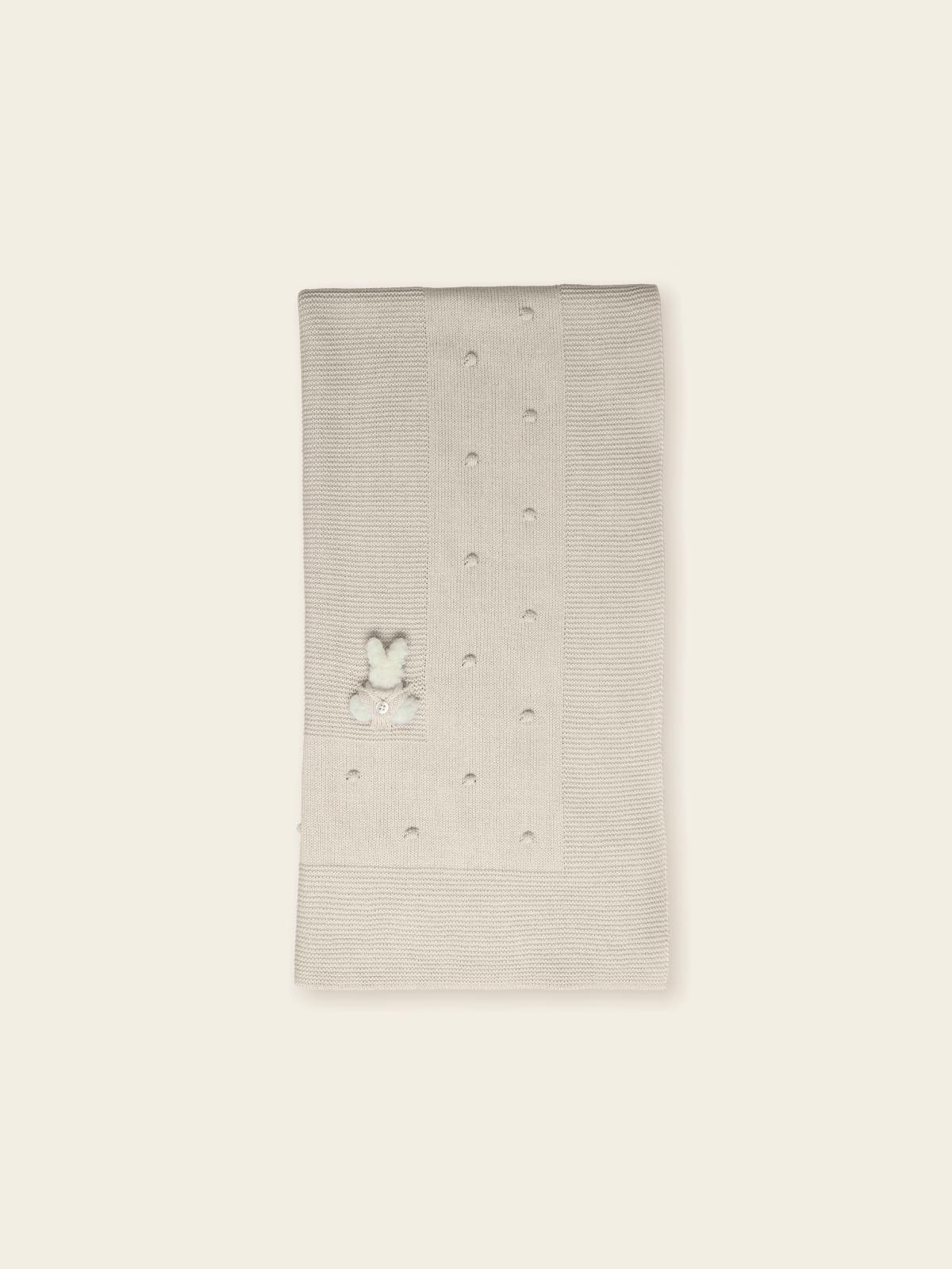 Toquilla bebé de punto en lana fina y suave, con bodoquitos y adornada con conejito de peluche