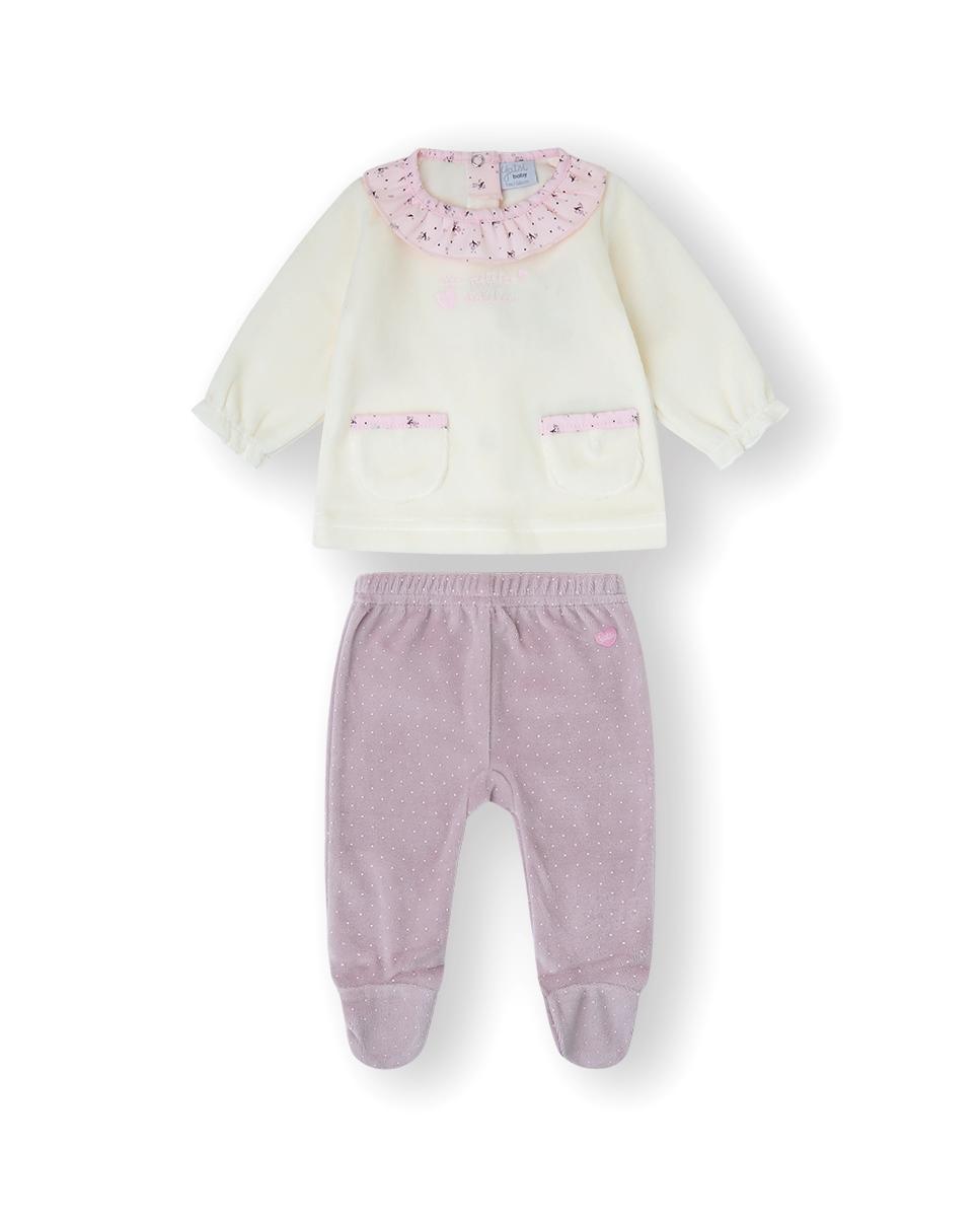 Conjunto Recién Nacida, Sudadera tundosada estampada, cuello redondo ribeteado, abertura trasera mediante corchetes, Polaina lisa tundosada con goma en cintura.Color: Blanco