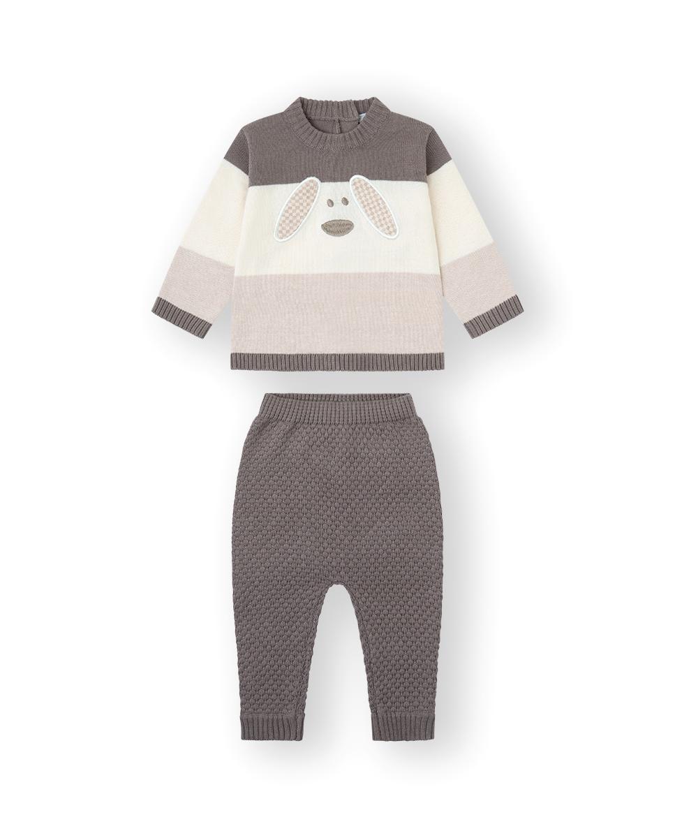 Conjunto para primera puesta de dos piezas, confeccionado en tricot, jersey tricolor con abertura en espalda y polaina lisa.