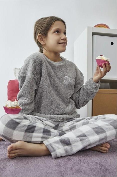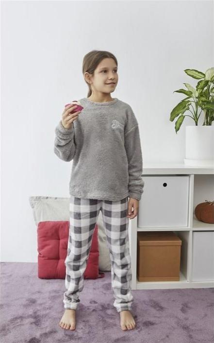 Pijama chica 2 piezas de terciopelo con terminación de puño en mangas y pantalón estampado con terminación en puño.