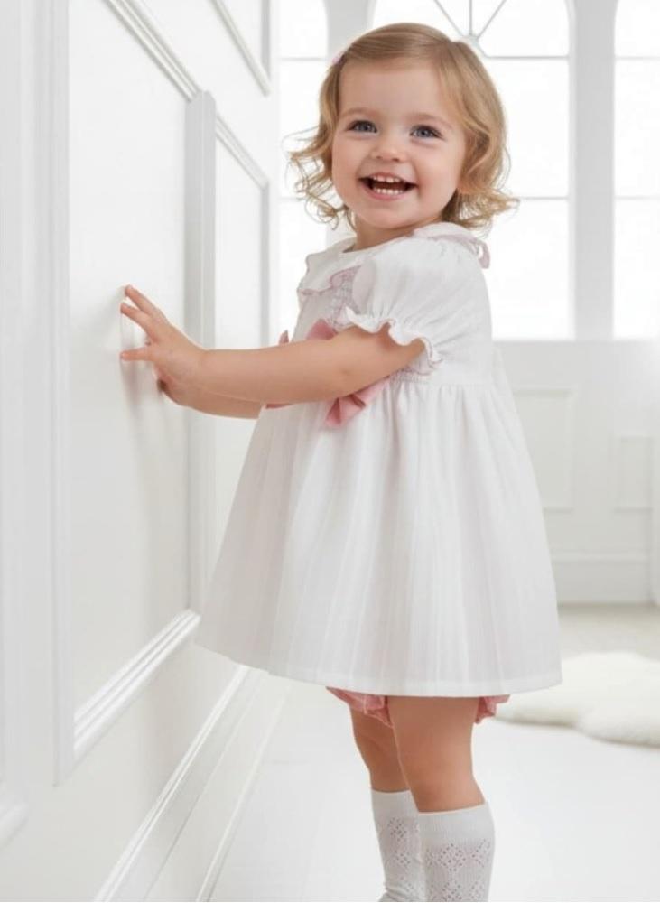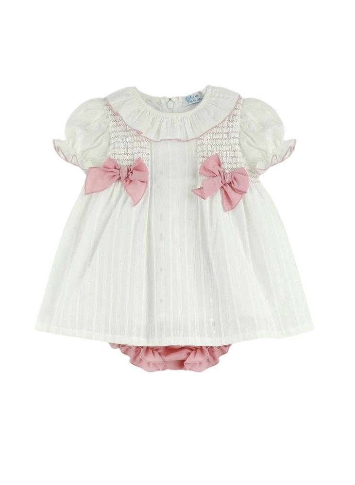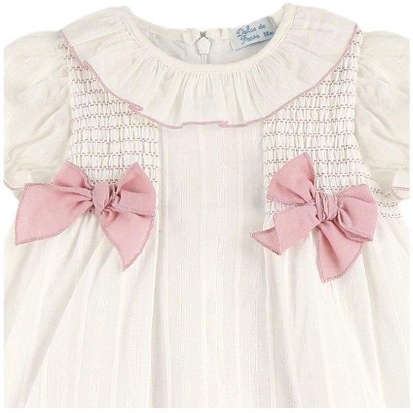 Jesusito niña de manga corta fruncida, con nido de abeja en canesú, adornado con lazos, volante en cuello y braguita rosa.