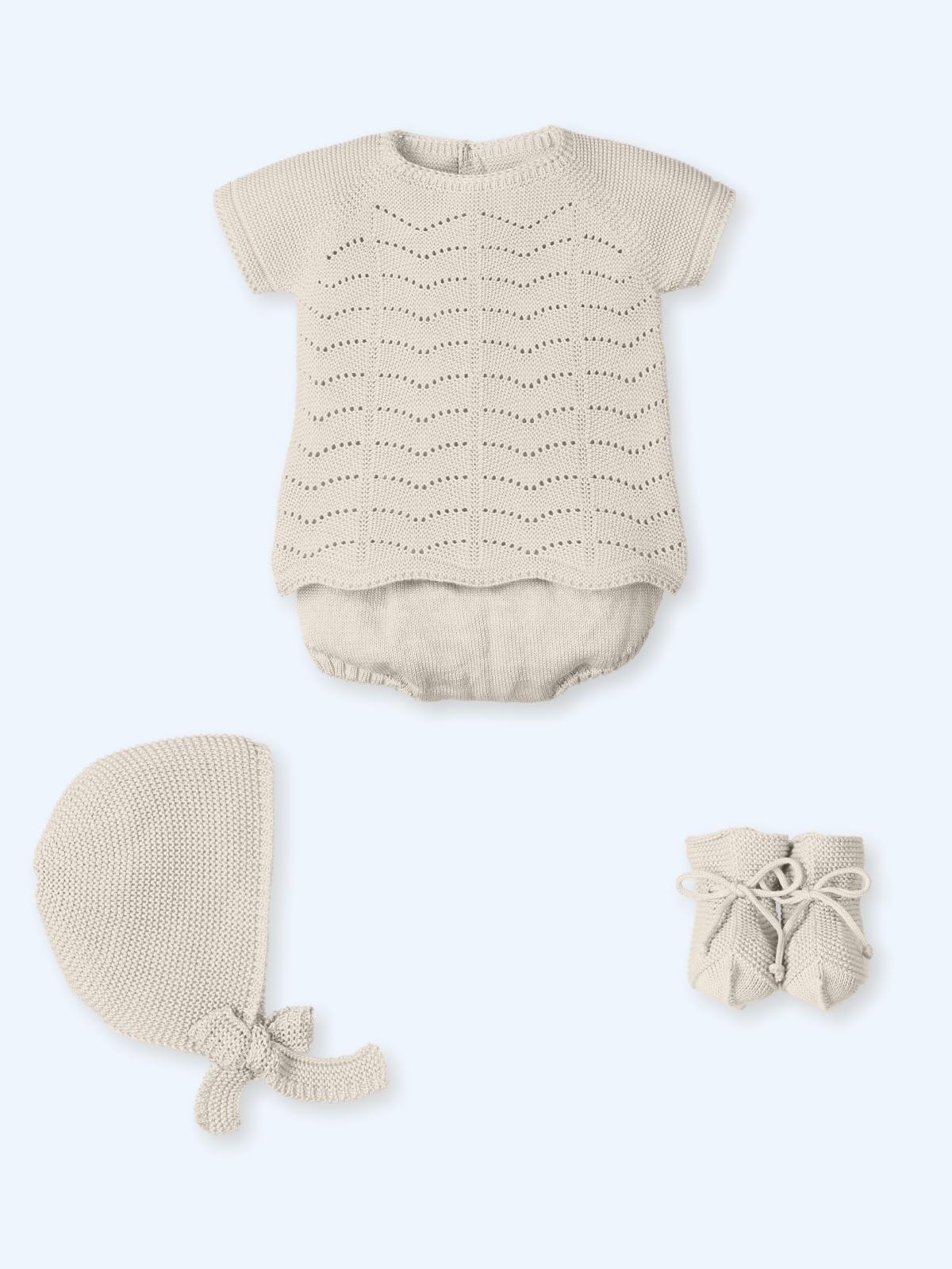 Conjunto Hilo 4 piezas para primeras puestas, Jersey, cubrepañal, capota y patucos.