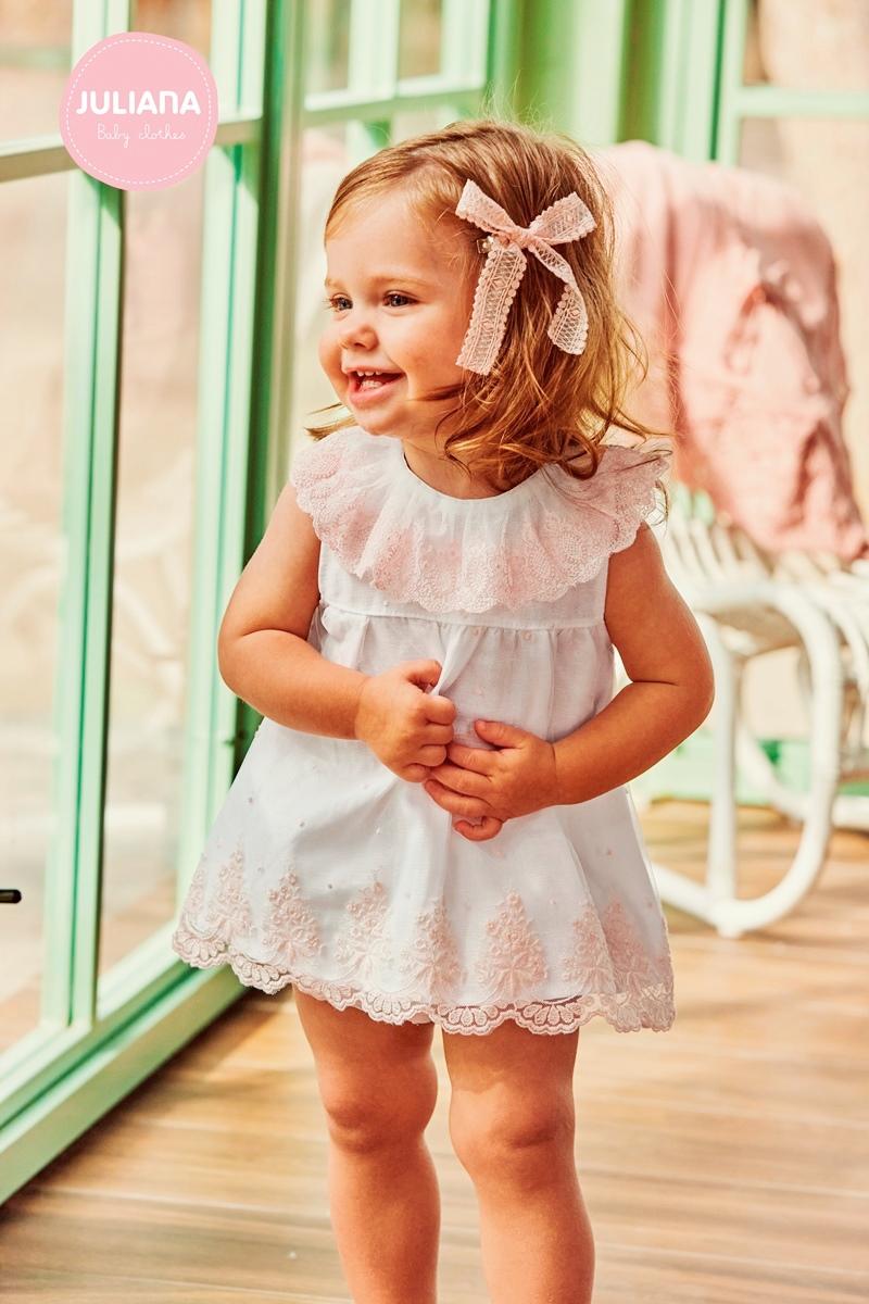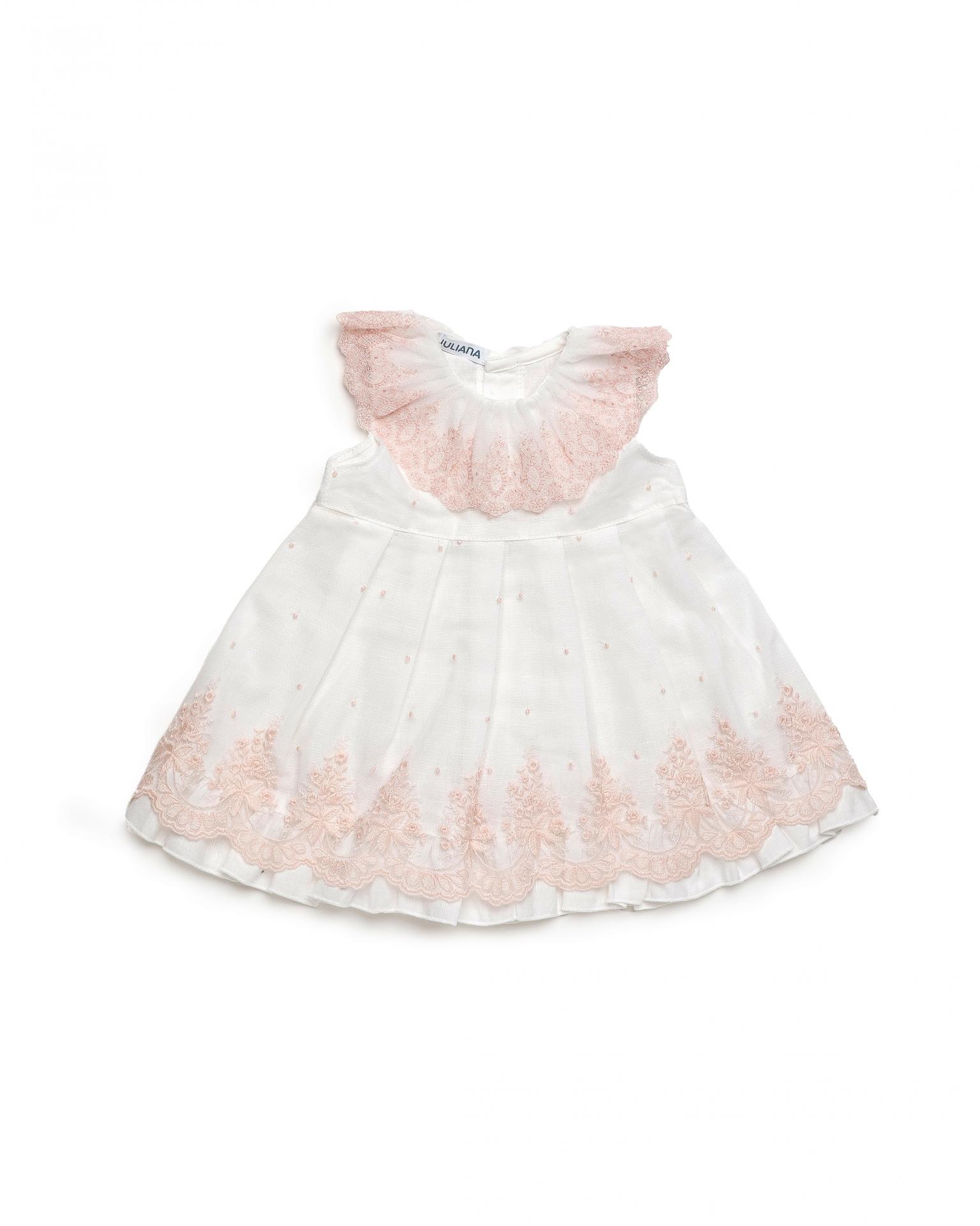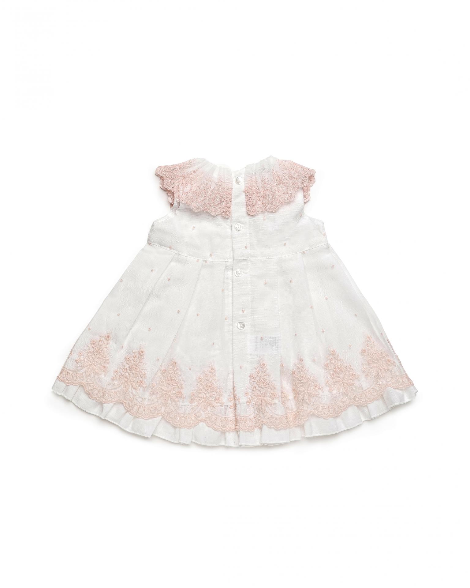 Vestido niña cortado en cintura, con bordados de encaje en rosa, abertura en espalda con botones.