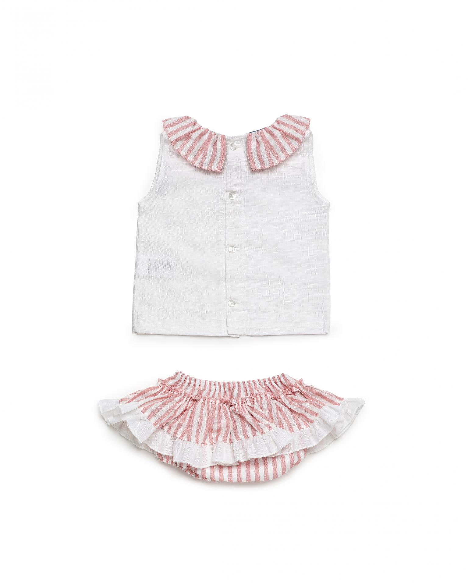 Conjunto niña, Blusa popelín con volante en cuello de rayas, abertura en espalda con botones y braga falda con mismo estampado de rayas