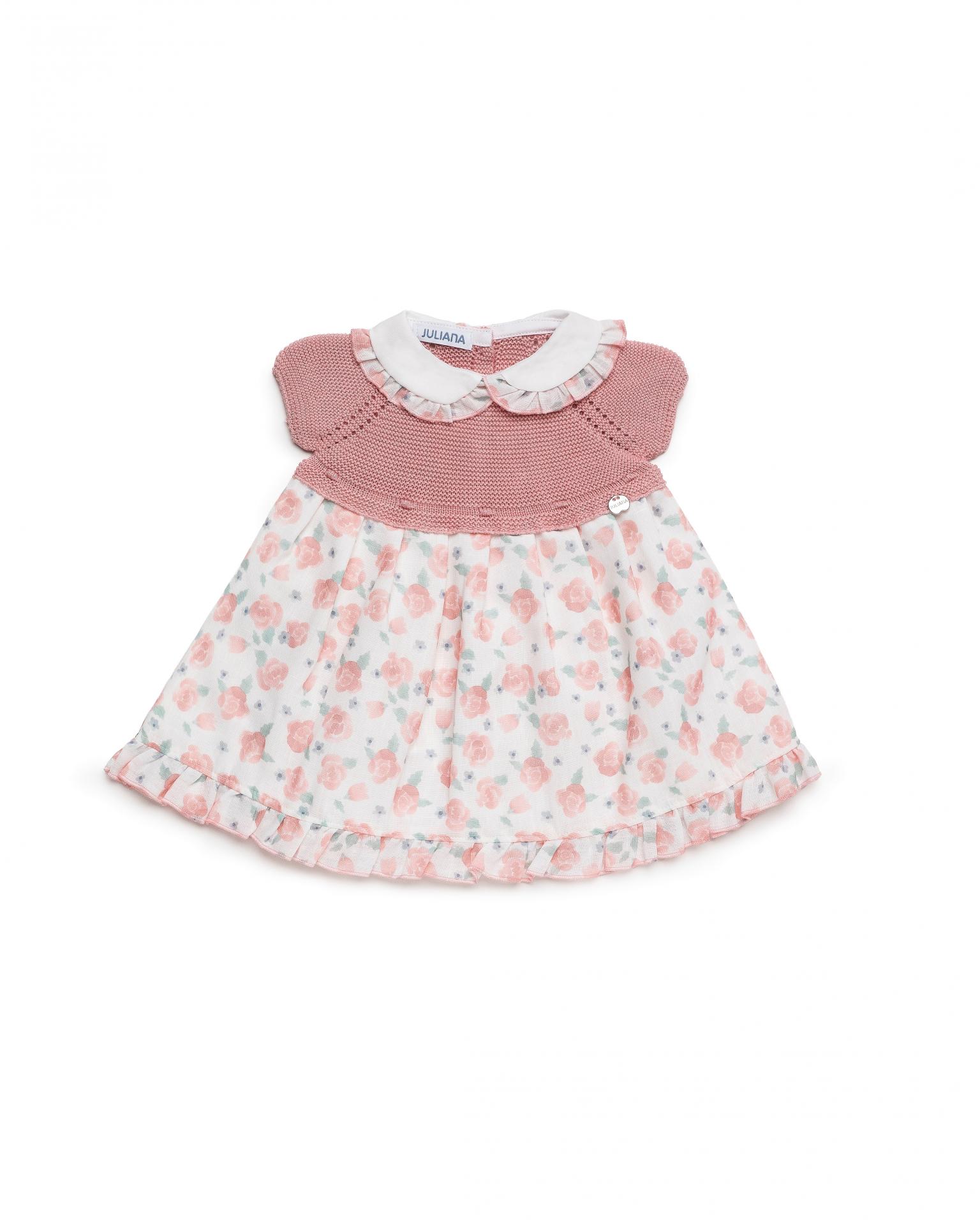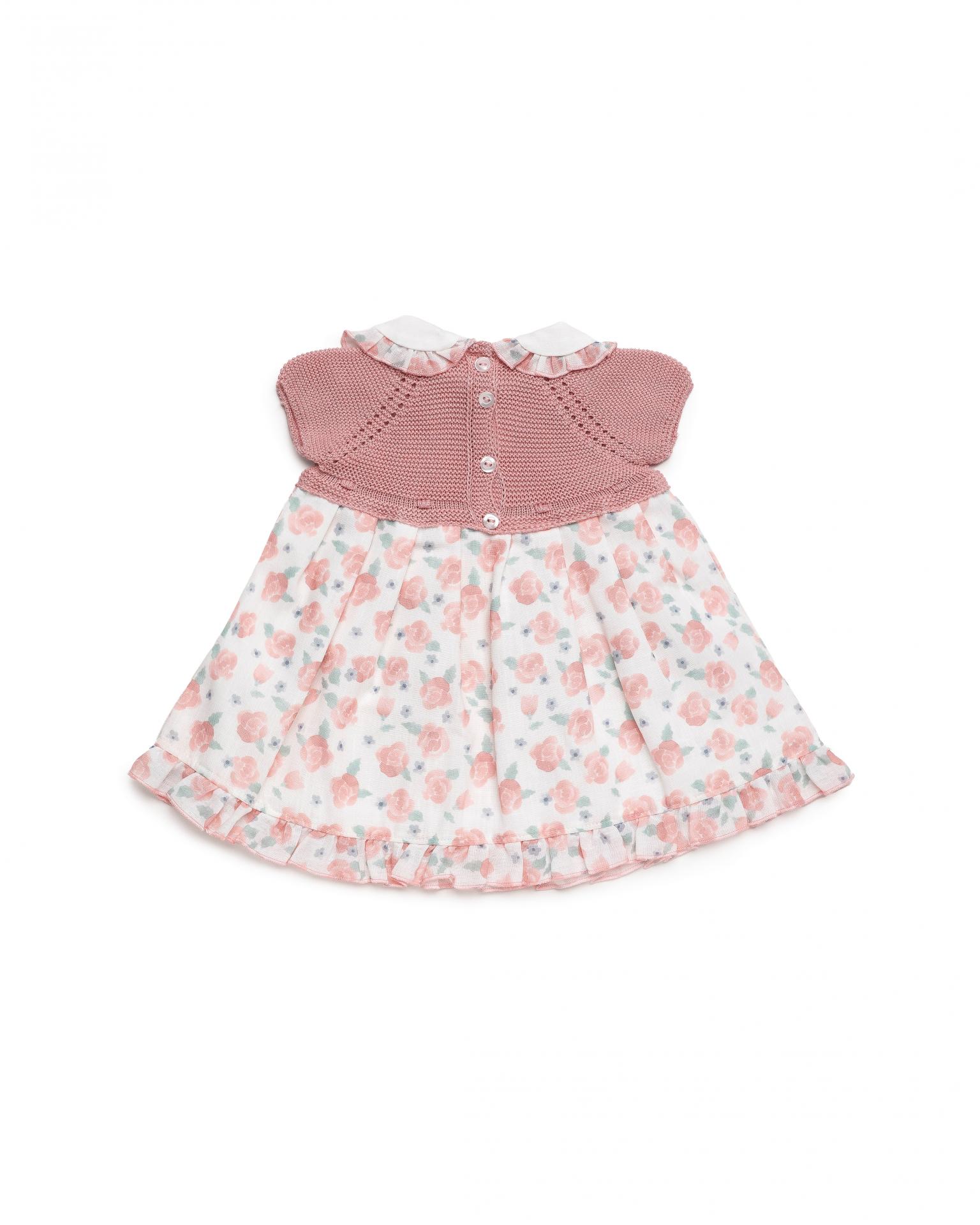 Vestido bebé niña combinado, con cuerpo de hilo con cuello bebé, abertura en espalda con botones y faldón de tela con estampado floral y terminación con volante