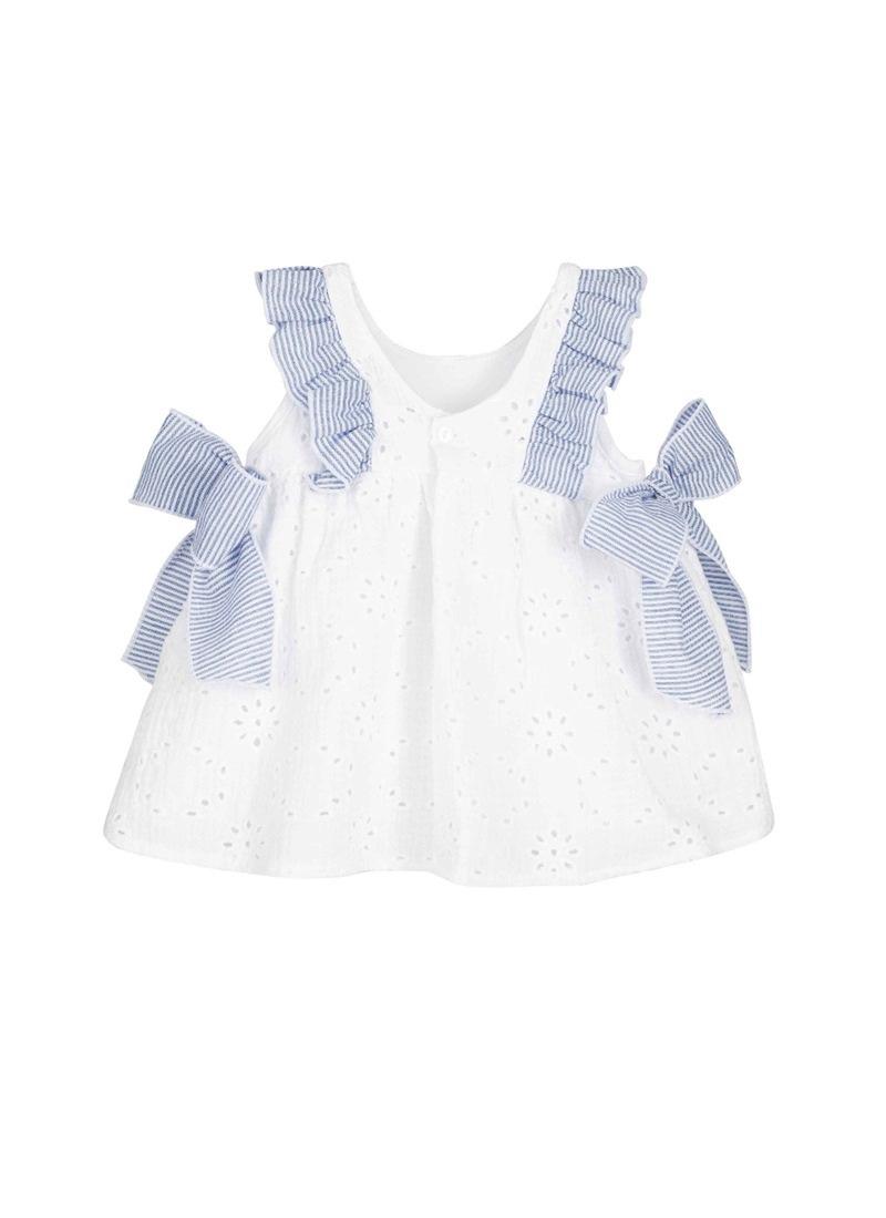 Vestido niña sin mangas en tejido troquelado adornado con volantes y lazos en estampado multirayas de la Familia KERALA