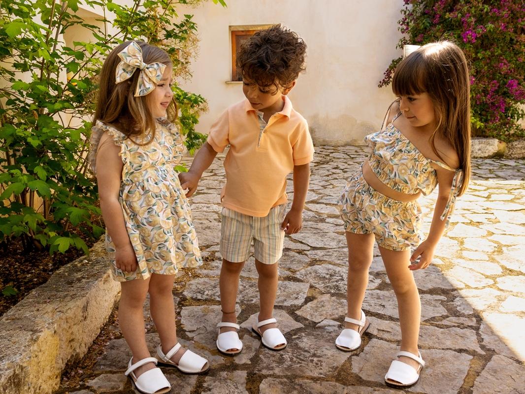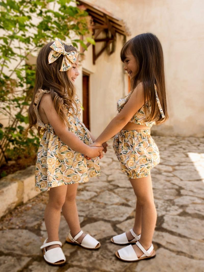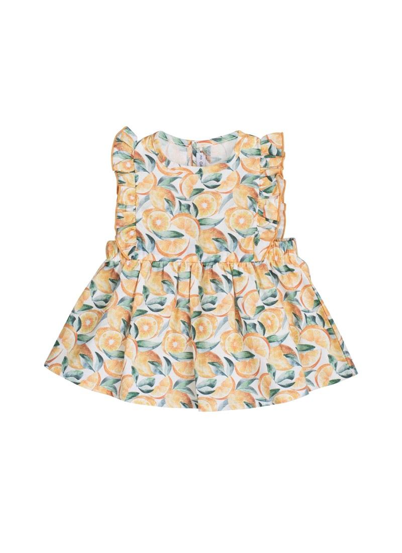 Vestido niña sin mangas adornadas con volantes en estampado de cítricos.