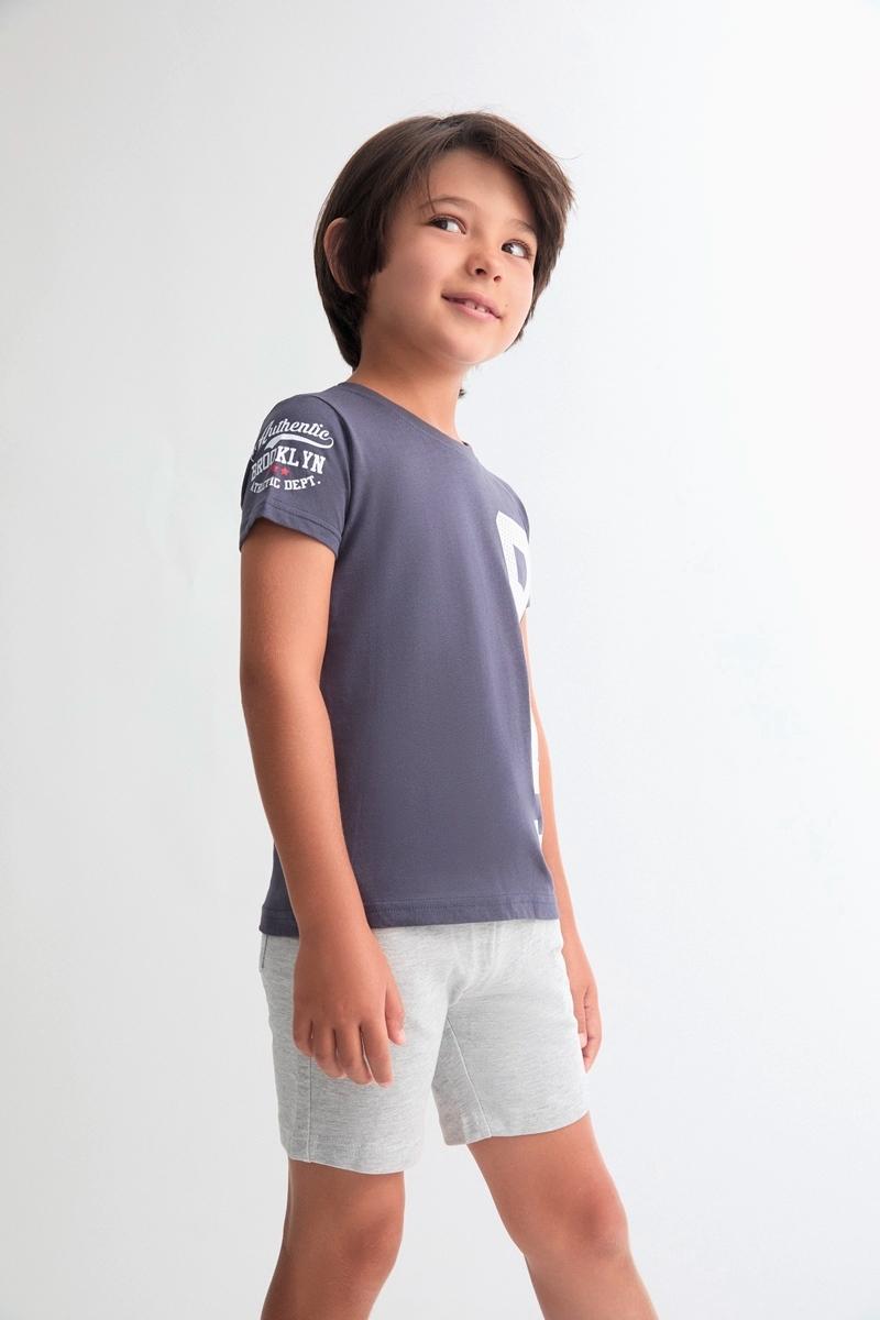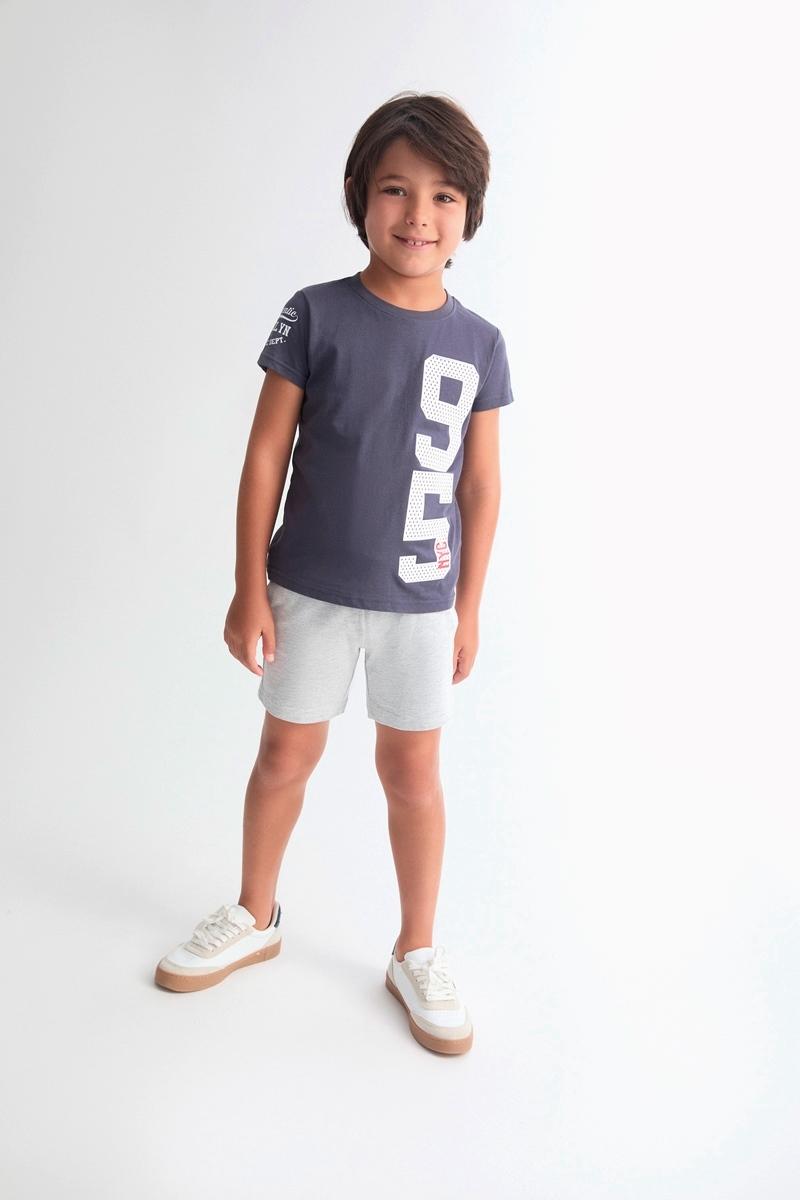 Conjunto niño, Camiseta de manga corta con dibujo en lateral y manga. Pantalón corto en color gris claro, bolsillos laterales, bolsillo trasero, goma y cordón en cintura