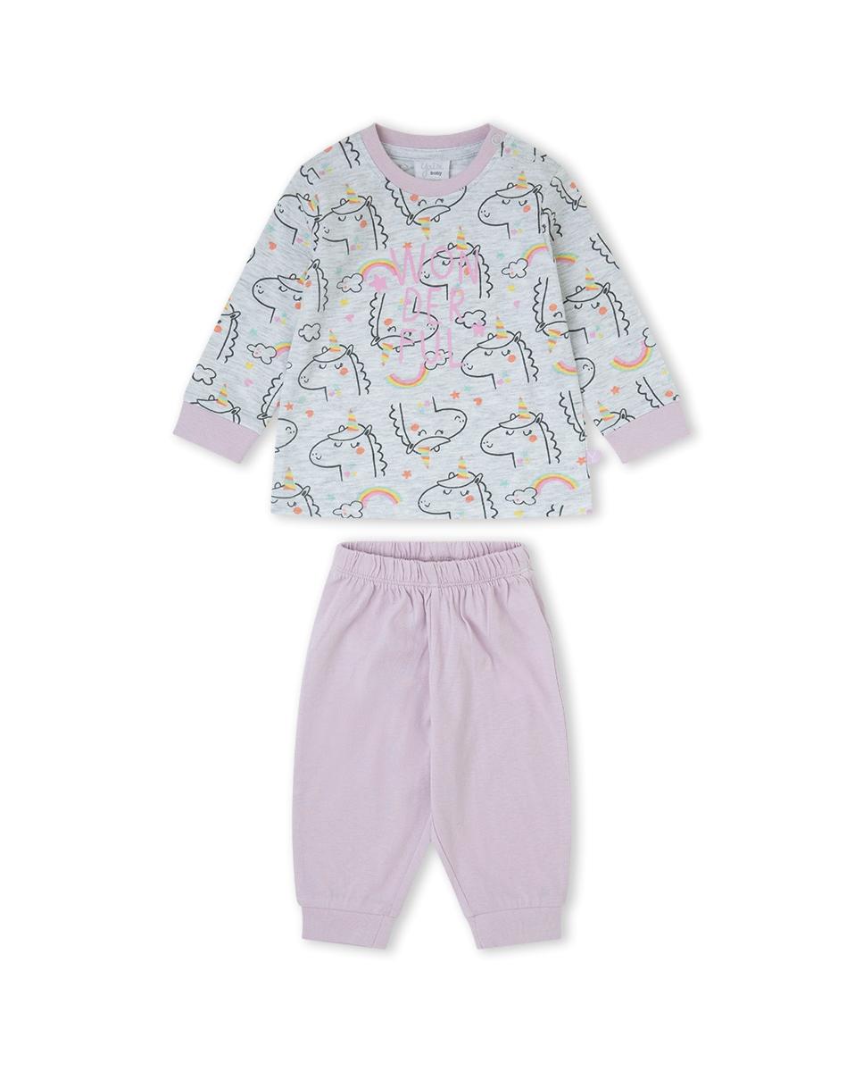 Pijama bebé niña en dos piezas estampado en algodón fino, con terminaciones en puño en mangas y bajo pantalón.