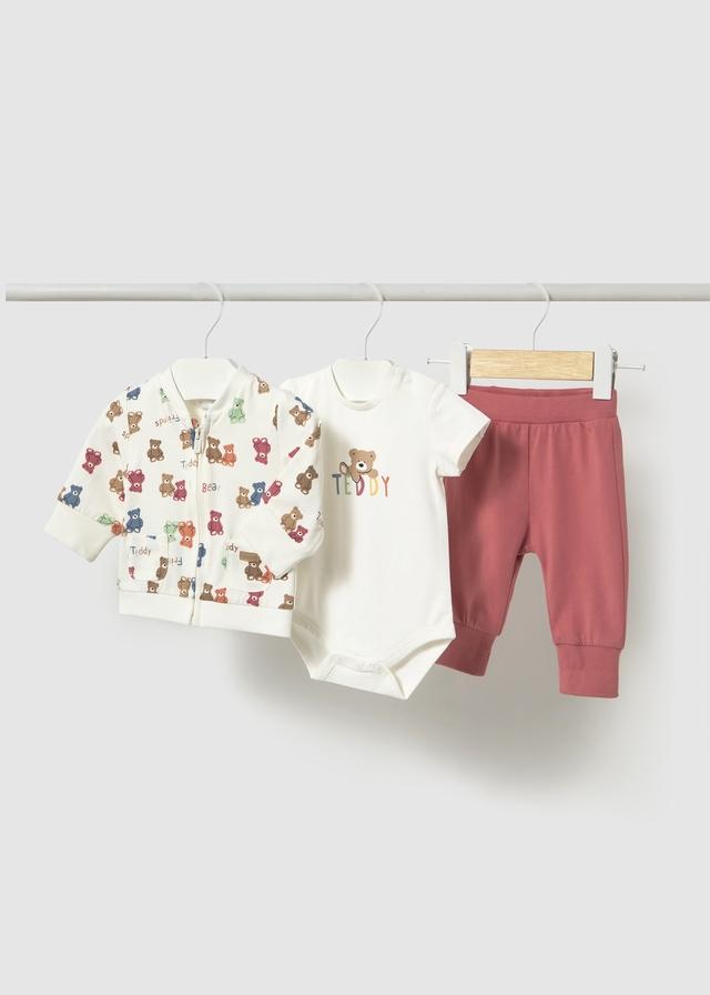 Chandal de 3 piezas para bebé niño. Chaqueta entretiempo estampada con bolsillos. Body de manga corta con dibujo. Cuello redondo. Pantalón con cinturilla elástica y bolsillos.Color: Terracota