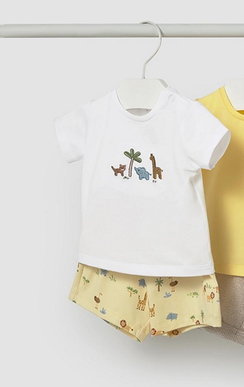 Conjunto de camiseta y pantalón corto para bebé niño Camiseta de manga corta para recién nacido. Cuello redondo. Botón a presión en el hombro para facilitar la puesta de la prenda. Diseño estampado.Cinturilla elástica. Se venden por separado