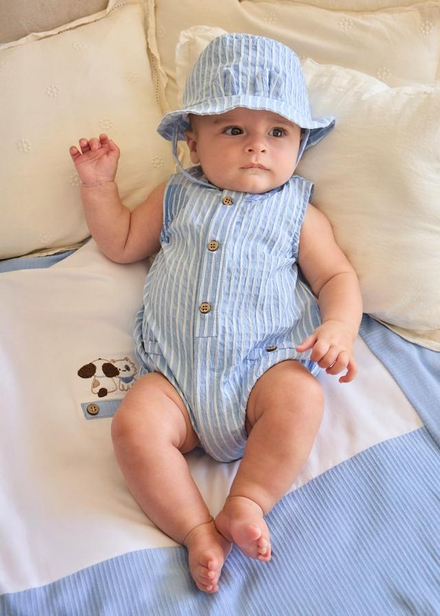 Pelele Ranita para bebé niño. Pelele estampado a rayas sin mangas. Semiabierto en delantero con botones Cierre con automáticos en la parte inferior. Gorro en mismo estampado confeccionado con tejidos suaves y ligeros, que le proporcionará momentos de frescura en los días más calurosos de primavera y verano.