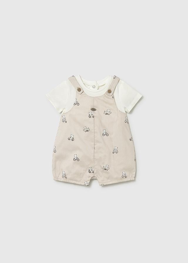 Pelele de manga corta para recién nacido. Diseño con peto simulado en superposición. Cierre con botones en la espalda para facilitar la puesta de la prenda. Cierre con botones en la entrepierna.