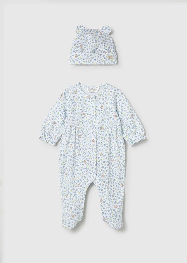Pelele estampado con gorro, cierre con botones a presión en espalda y en entrepierna para facilitar la puesta de la prenda. Gorro mismo estampado