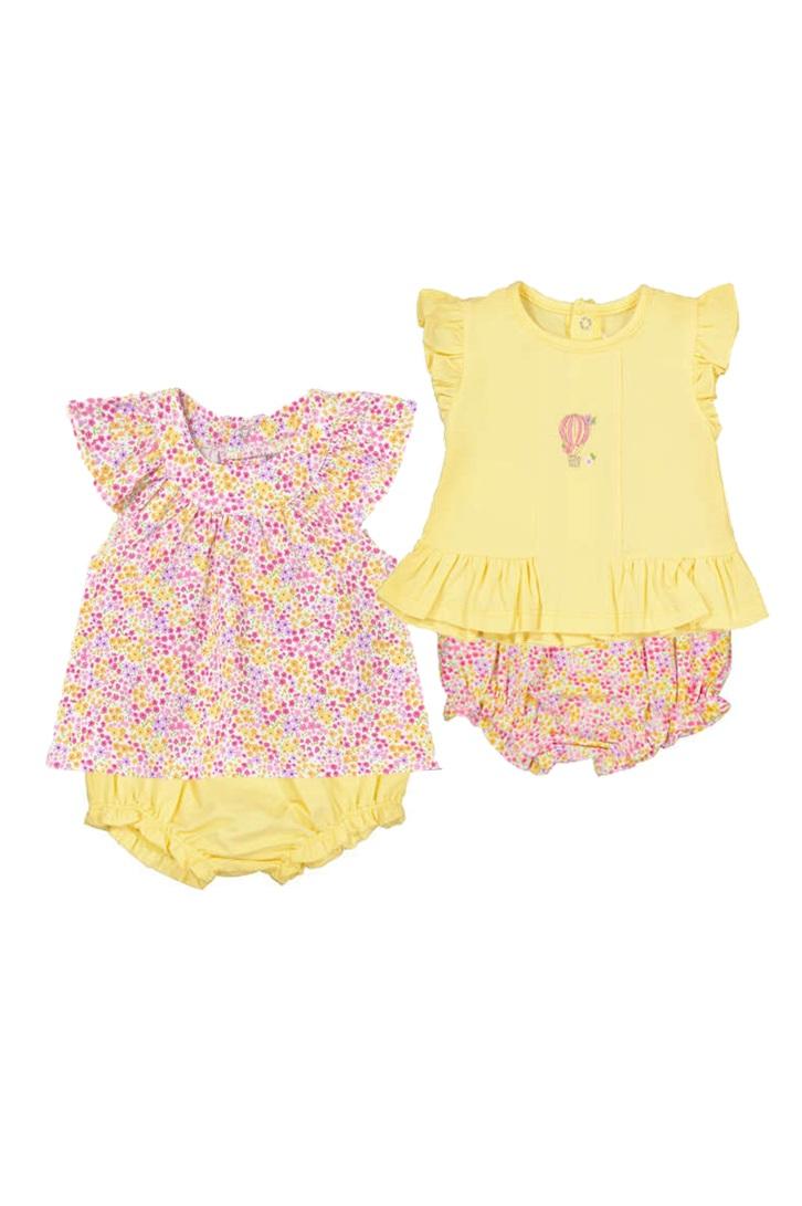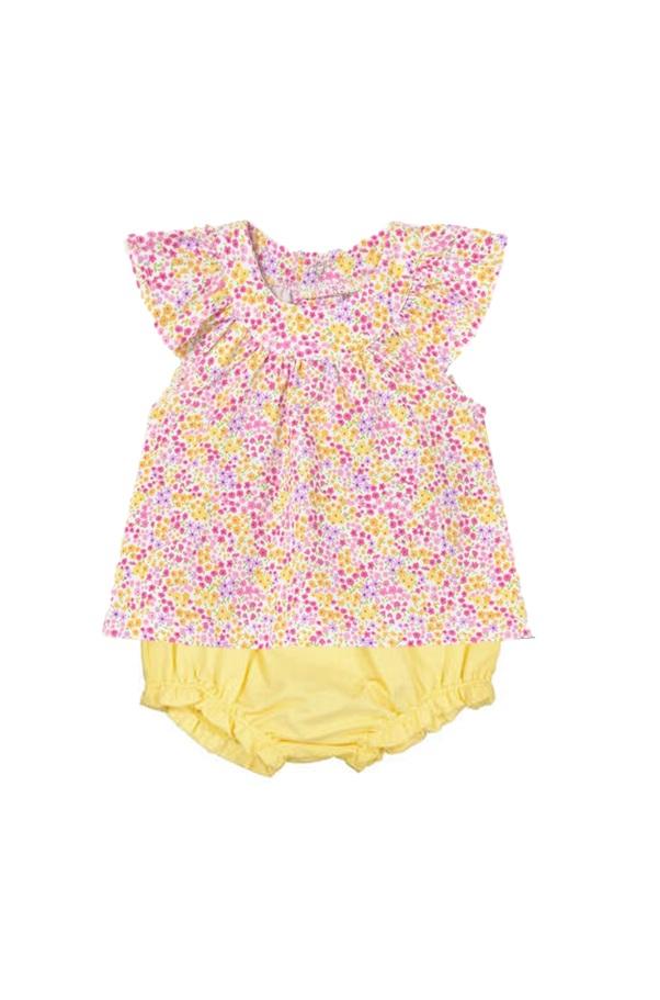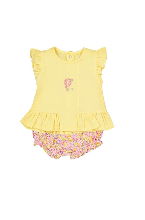 Camiseta de manga corta con bordado en delantero y pololo estampado. Camiseta de manga corta estampada y pololo liso.
