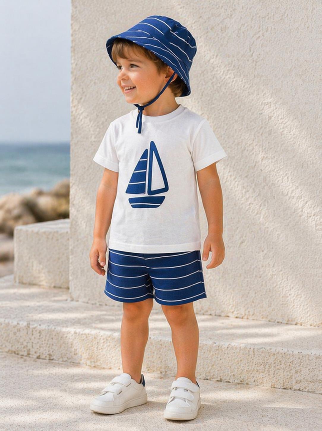 Conjunto de punto con gorro para niño, camiseta manga corta con bordado, bermuda y gorro de rayas