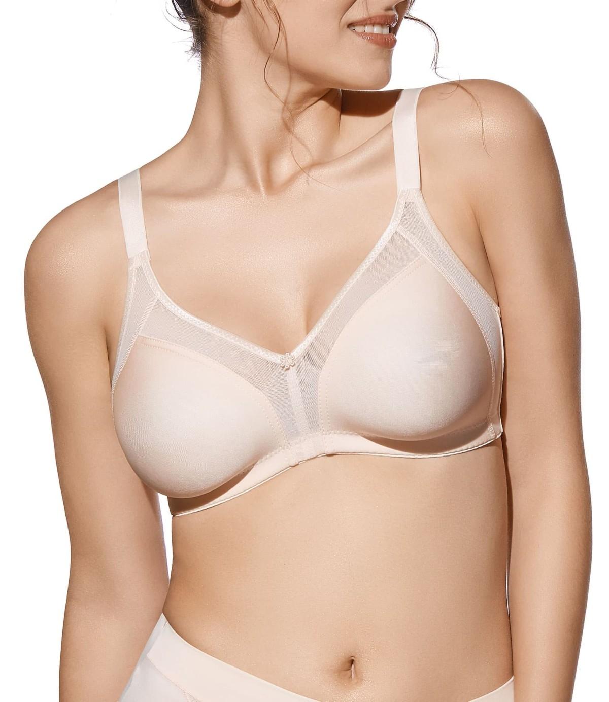 Sujetador sin aros y sin relleno con doble capa de microfibra satinada e inserciones de tul. Copa C