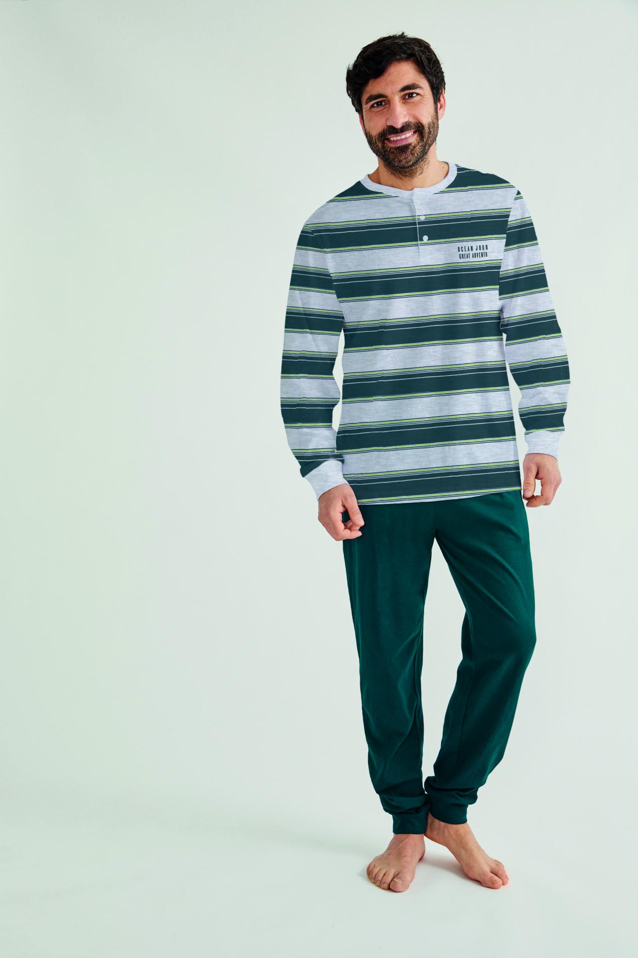 Pijama hombre en algodón fino de manga larga con abertura de botones y tapeta, pantalón largo con terminaciones en puño